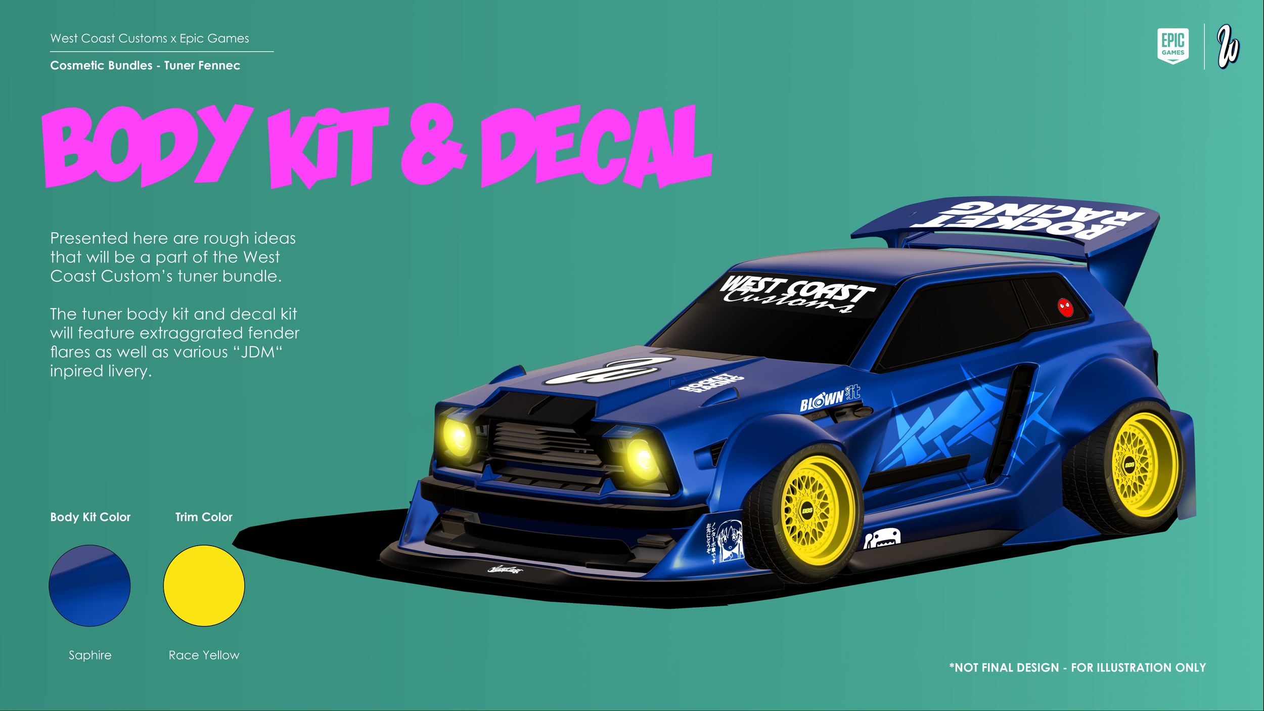 The mock-up includes 3 distinctive body-kits for Fennec, a vehicle from Rocket League, game UI, POI, and potential activations.